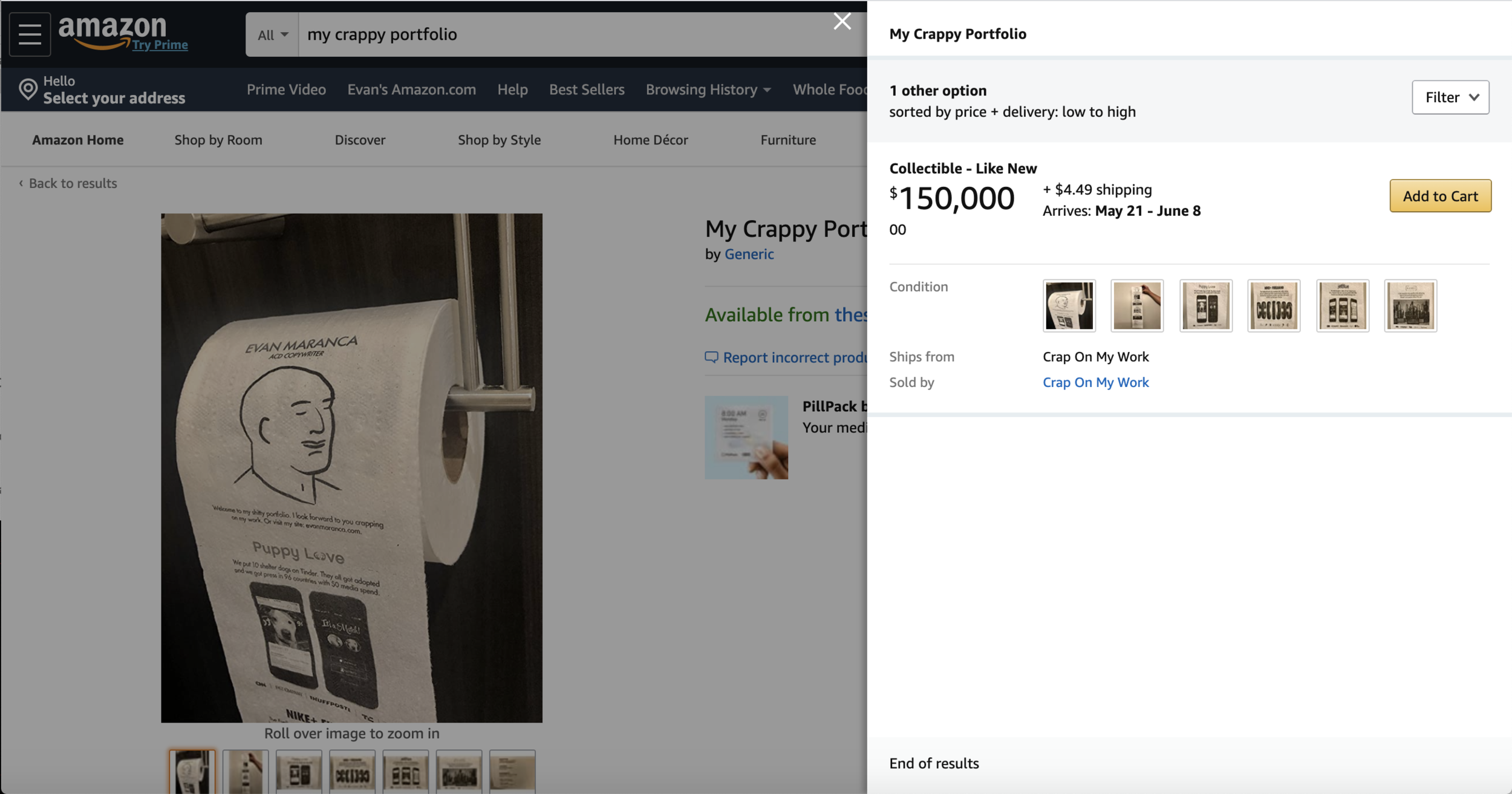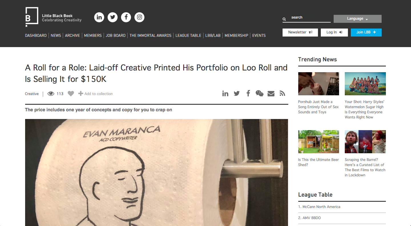 When I was laid off during the pandemic the only thing harder to come by than a new job was toilet paper. So I decided to print my ‘Shitty Portfolio’ on a roll of TP and sell it for the price of my salary. A roll for a role, if you will.