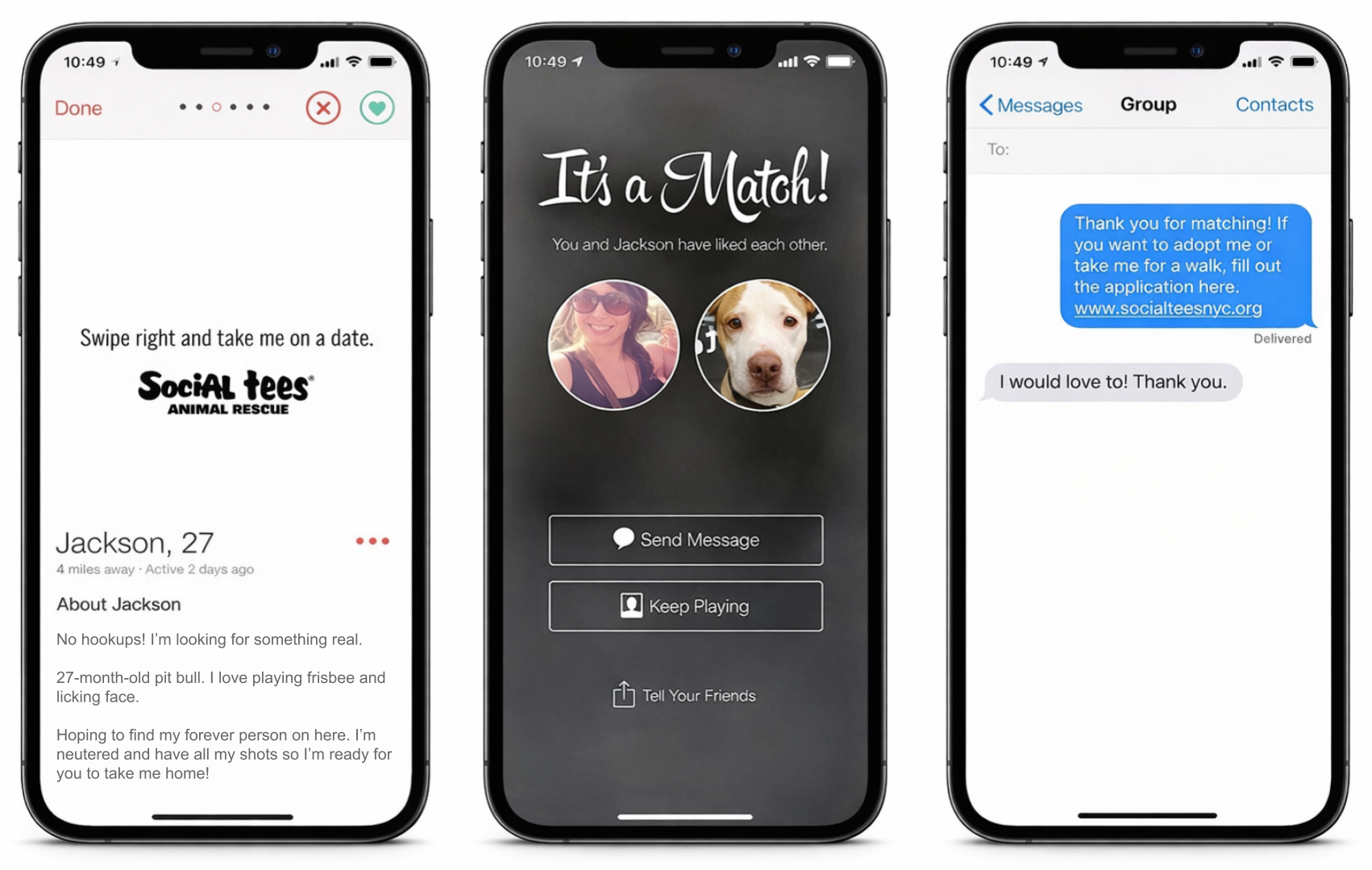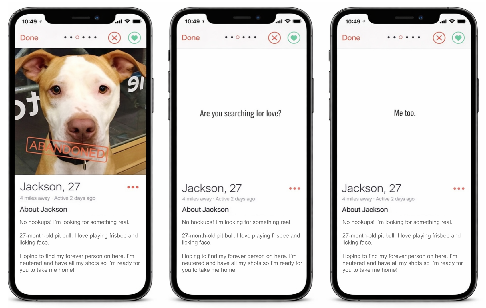 Since people on Tinder aren’t exactly looking to settle down right away, we offered the option to walk, foster or adopt the dogs.